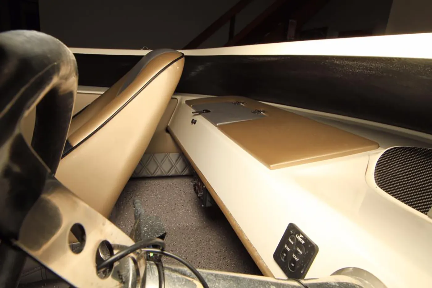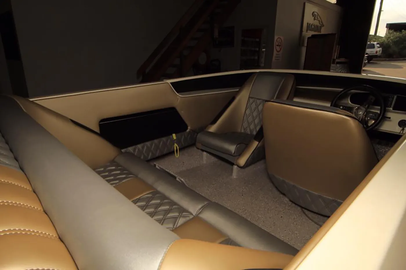 We used a new style of marine vinyl in this Bullet boat. With a satin gold and silver finish it really stands out. We custom fitted the seats, then used double diamond stitched inserts for a much more modern look.
