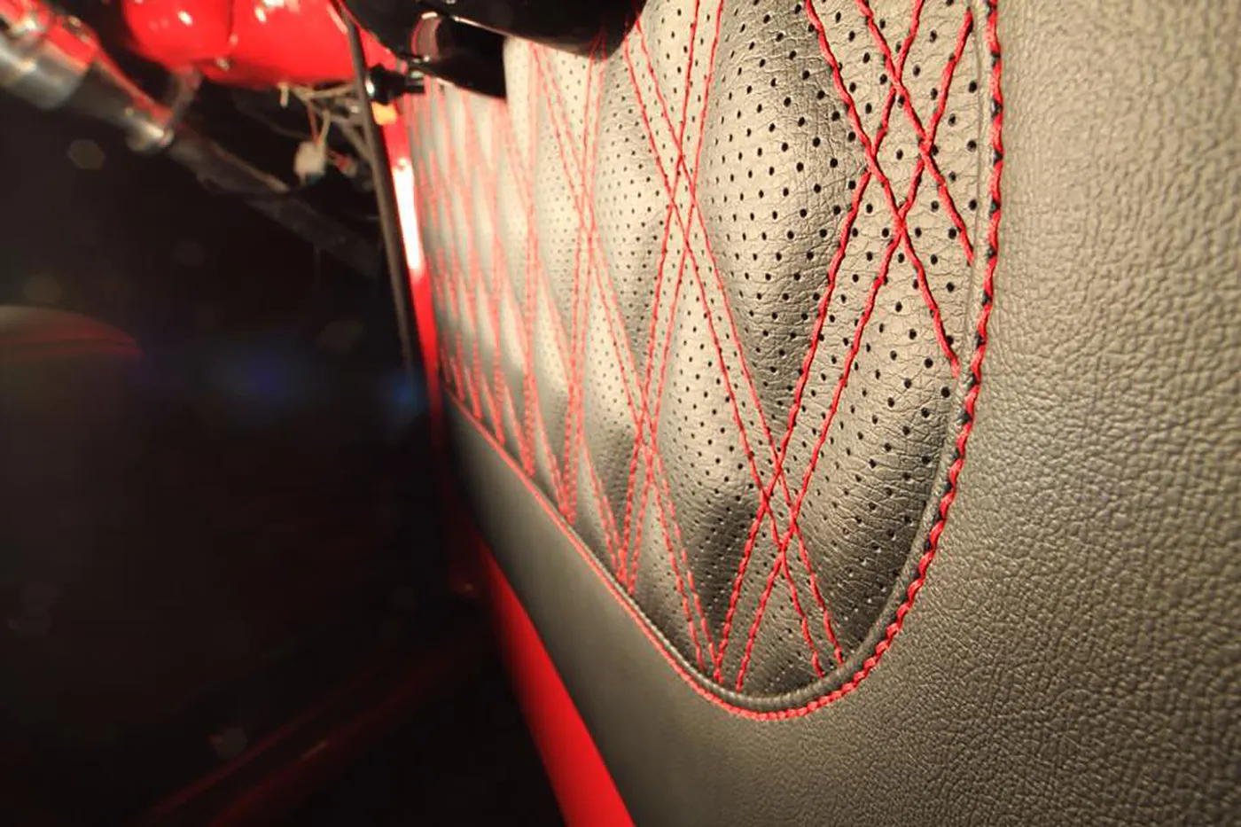 F Jay is now finished! We used a new braided thread for the stitching on this trim its a little thicker than normal and gives the stitch much more colour than the standard thread. We also flush mounted the speakers in the kicks and custom made our own grills to suit. New doortrim boards made from Alupanel so they will never rot away. Hand fitted jet black carpet throughout with heat proof underfelt installed to keep the interior cool. We recovered the billet steering wheel with black Nappa leather and gave the gear stick a new boot as well.
