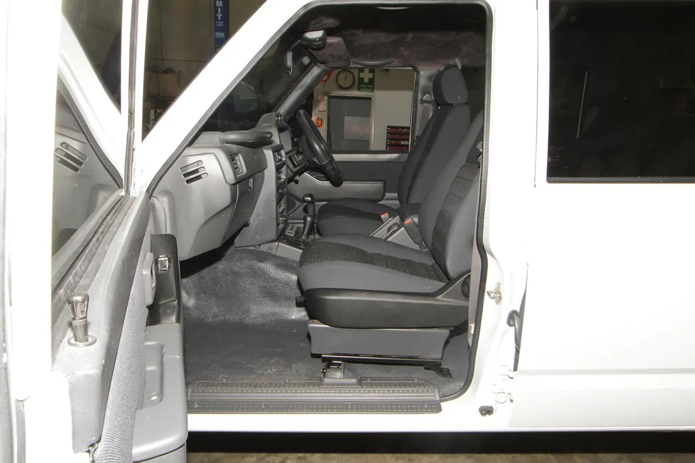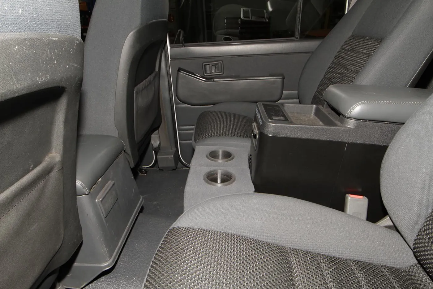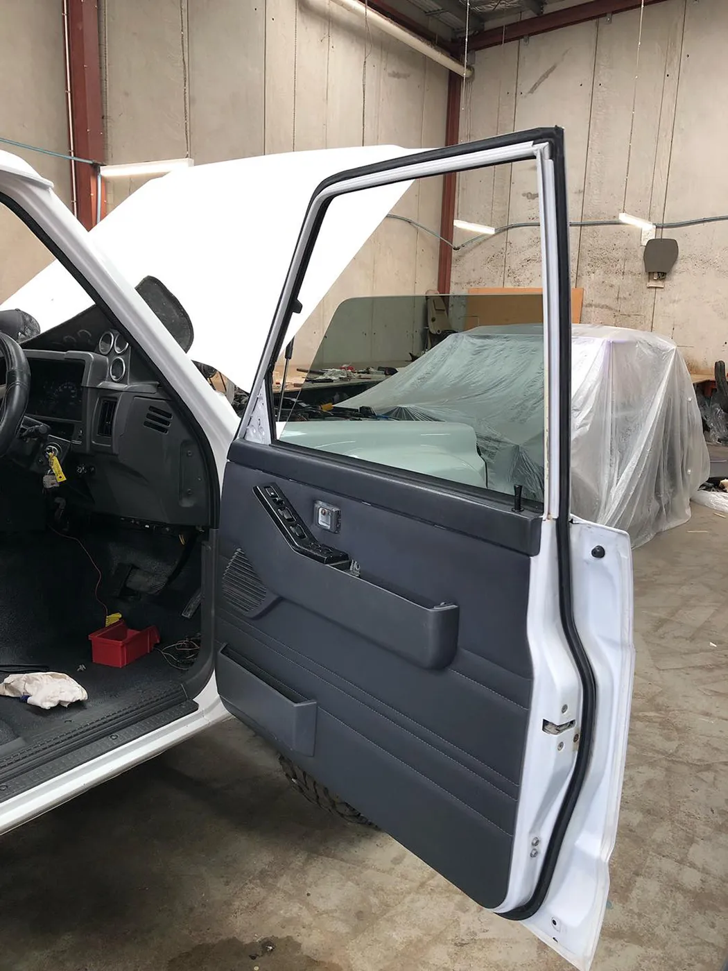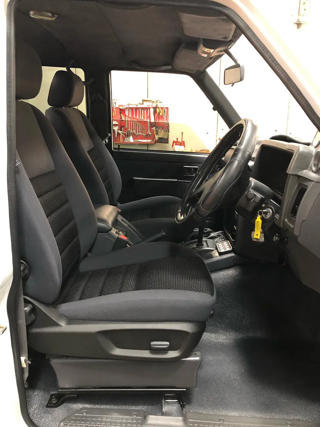 This chopped GQ patrol came in as a bare shell only with VE seats mounted up front. We customised the original rears seat frames to accept VE seats to match the front and fabricated a very strong mount for the Brass Monkey console fridge. In front of the fridge we made up some infill boxes with 3D printed cup holders to perfectly fit a can. All the seats were then recovered in grey and black cloth to complement the original colours of the GQ. The doortrims were treated to a new set of backing boards which we cut from Alupanel and recovered in the factory design. Headlining in the GQ were usually a very cheap vinyl, so we scrapped that one and hand fitted a new suede one and also recovered the sunvisors and recoloured all the plastic trim to suit. Dynamat, underfelt and carpet were also added to the rear wall to keep the road noise down. High quality rubber flooring was installed over thick underfelt and we customised the front console to clean up the front half of the car.