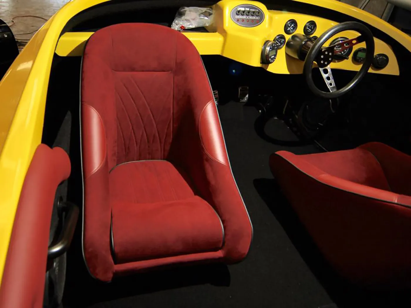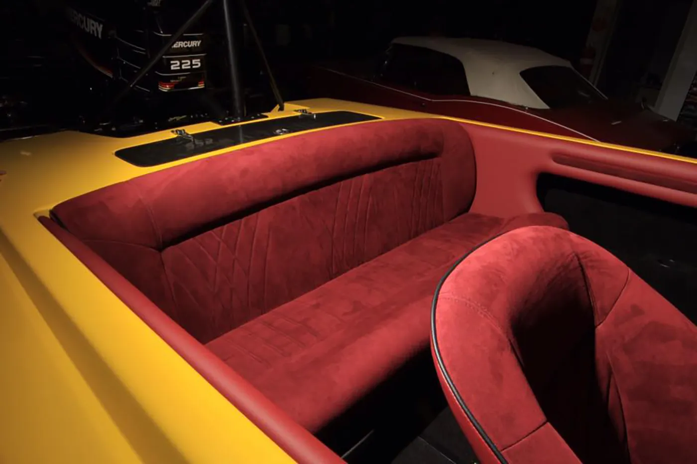 For this boats interior we went away from the traditional boat materials and used a burgundy Alcantara for the seats, and our tradesman, Kailen nailed it with a custom inserts, burgundy vinyl sides and accents with black piping to set it off.